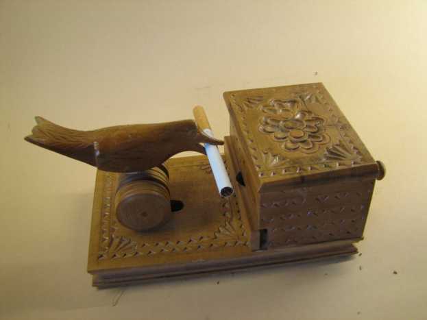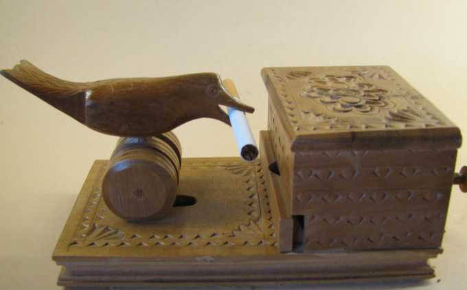 der Vogel neigt sich zur Lade, in der eine Zigarette sichtbar wird.