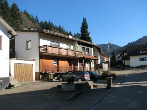 Am Eingang der Wiedenbach der Bäcker Streck, im Hintergrund Holzstapel des Sägewerkes Baumann