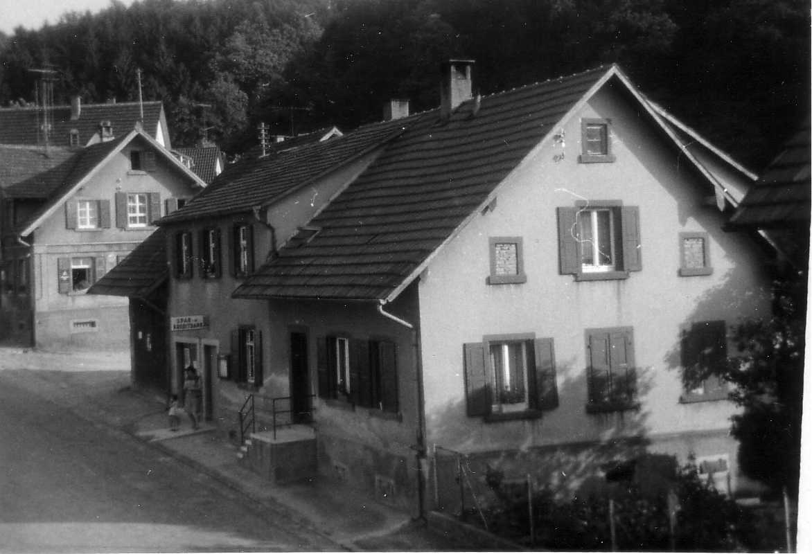 Sie stehen heute beide nicht mehr: links Gasthaus Linde im Vordergrund Haus Armbruster mit der Filiale der Spar-und Kreditbank. Heute steht hier die Schwarzwald-Apotheke.