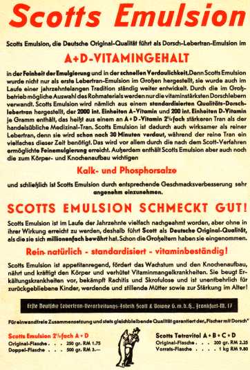 Bis in die 1960er Jahre gehörte der aus Dorsch-, Kabeljau- oder Schellfischlebern durch Erhitzen gewonnene Lebertran zum absoluten Standardrepertoire der häuslich genutzten Arzneimittel. Die unangenehm riechende Flüssigkeit verdankte ihrem hohen Vitamin A und D-Gehalt, dass sie vor allem zur Vorbeugung und unterstützender Heilung von Rachitis, eine der häufigsten Krankheiten des 19. Jahrhunderts, eingesetzt wurde. Dem sehr unangenehmen Geschmack und Geruch des Lebertrans versuchte man mit allen möglichen Mitteln entgegenzuwirken. Die milchige Lebertranemulsion ließ sich leichter verabreichen. Außerdem waren ihr einfacher geschmackskorrigierende Stoffe zusetzen, sie war dadurch sehr viel angenehmer im Geschmack als der schier ungenießbare pure Lebertran. Die Verarbeitung im Emulgor, in den 1930er Jahren ein großer Fortschritt, wurde in den 1960er Jahren mehr und mehr eingestellt. Die noch sehr junge Vitaminforschung - ein erstes Vitamin-C-Präparat kam erst in den 1940er Jahren auf den Markt - hatte die negativen Reaktionen von Vitaminen bei Berührung mit Sauerstoff nachgewiesen. Man stellte fest, dass bei der Verarbeitun im Emulgor die Vitamine mit zuviel Luft in Berührung kamen.