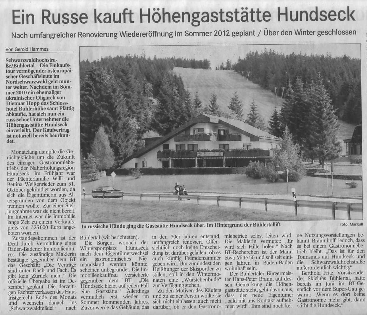 Neues von der Hundseck: Ein Russe kauft Höhengaststätte Hundseck Skihang - Pläne (6./7.10.11) BT