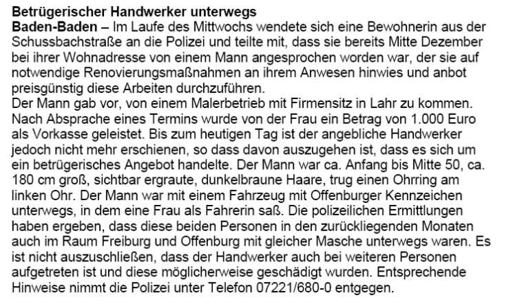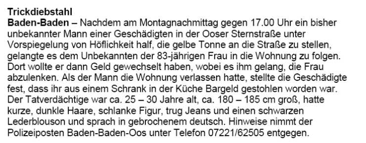 Täterbeschreibung: 180-185 cm groß, 35-40 Jahre alt, schwarze