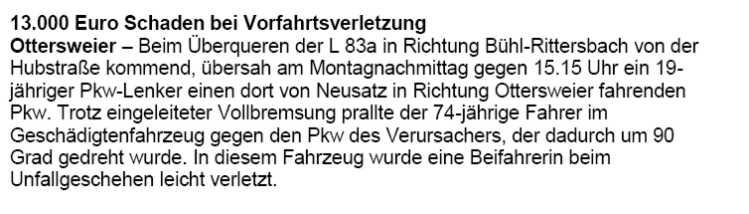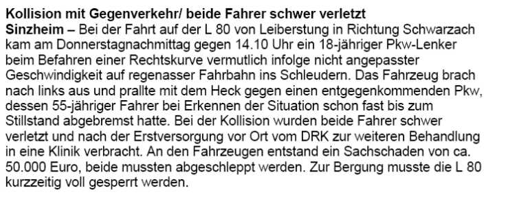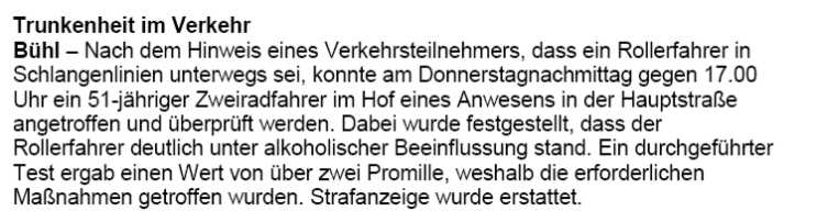 ermittelt werden. Ein weiterer alkoholbedingter Verkehrsunfall, mit weit