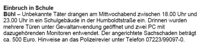 gebeten werden sich an die Kriminalpolizei Rastatt, Telefon: 07222/7610,
