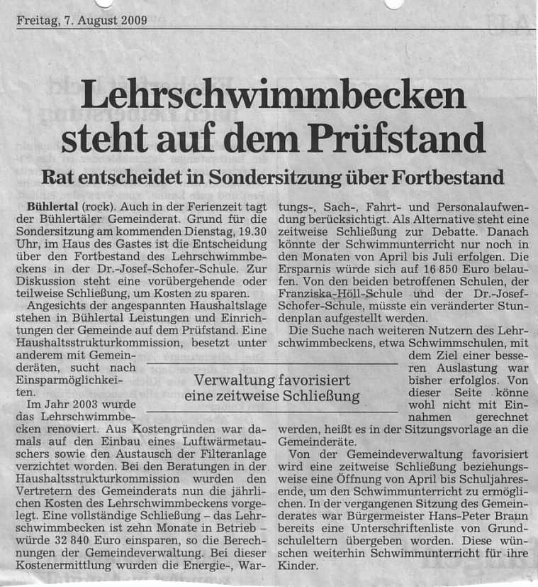 Was wird aus dem Lehrschwimmbecken im Eichwald?????? Presseartikel Vor der Entscheidung: